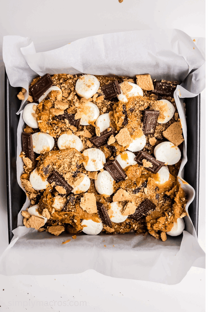- Drop spoonfuls of the reserved batter over the marshmallows and chocolate, leaving some areas exposed for a gooey top. Sprinkle with the reserved crushed graham crackers and chocolate pieces.